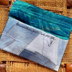 Pochette hippie faite avec des tissus upcyclés, ornée de beaux galons ethniques!