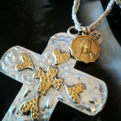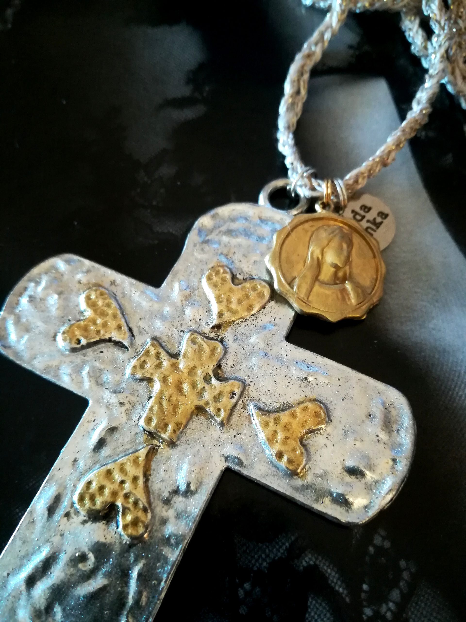 Lien crocheté en coton et lurex, longueur ajustable avec perle en plastique coulissante, médaille religieuse plaqué or et grande croix en métal argenté et doré 9,4×6,5cm, finitions pompons recyclés.